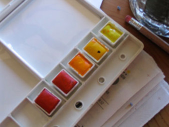 The first 6 colors selected were easily decided: the primary (red, yellow, blue) and secondary (orange, green, violet) colors. All the other paint colors had to be tested. Seeing these colors within pans does not reveal their true color quality and level of transparency. Follow link to see the process: LINK | ||||||||||||||||||||||||||||||||||||||||||||||||||||||||||||||||||||||||||||||||||